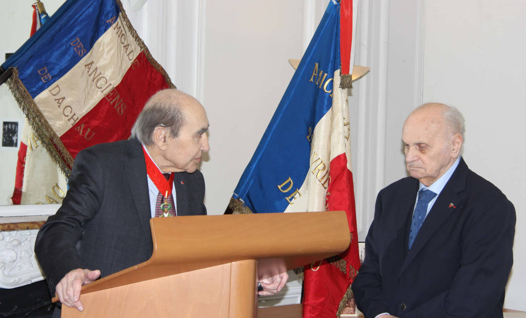 Pierre Schillio wird von seinem Deportationskameraden Jean Samuel am 3. April 2024 in Paris zum Offizier der Ehrenlegion befördert.